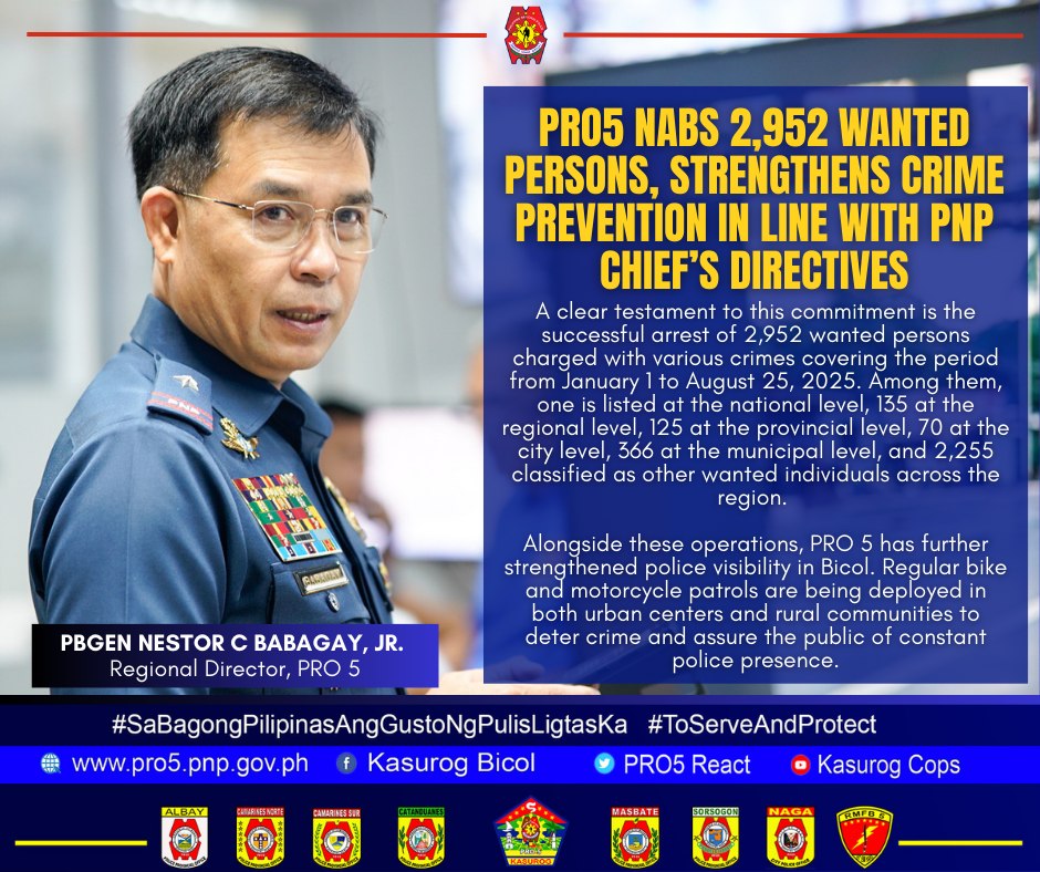From January 1 to August 25, 2025, PRO5 recorded a total of 2,952 arrests of wanted persons for various charges. Among them were one national-level fugitive, 135 at the regional level, 125 at the provincial level, 70 at the city level, 366 at the municipal level, and 2,255 classified as other wanted individuals. These accomplishments were achieved through continuous manhunt operations, enhanced investigative work, and dedication of the Kasurog Cops to ensure that offenders are held accountable under the law.